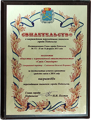 Постановлением Главы Подольска коллектив предприятия награжден за успехи в развитии связи переходящим знаменем Подольска.