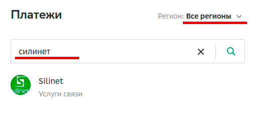 2. Далее в «Переводы и платежи», здесь установите «Все регионы» и в поле поиска введите silinet или силинет (или ИНН 5036116657). Нажмите «Искать».