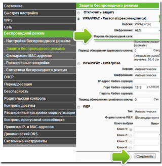 | 2.7. Теперь слева выберите раздел Защита беспроводного режима. Нажмите кнопку Сохранить. | ![]() |