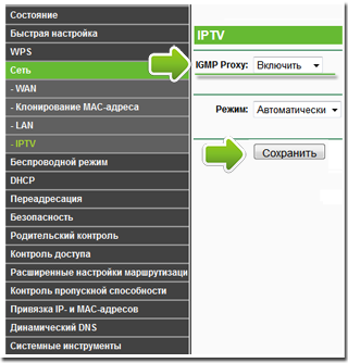 | 2.8. Теперь проверим настройки для просмотра Цифрового ТВ Справа в поле IGMP Proxy должно стоять Включить Нажмите кнопку Сохранить. | ![]() |