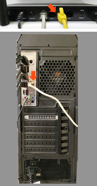 | 2.2. Соединяем роутер с компьютером (ноутбуком) сетевым кабелем (патчкордом) (в комплекте с роутером). Кабель одной стороной подключаем в любой разъем LAN в роутере, другой стороной в разъем RJ45 компьютера (ноутбука).