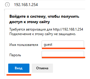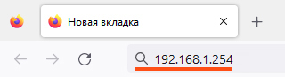 | 2.3. В компьютере запускаем браузер (Firefox, Google Chrome, Microsoft Edge) и набираем в строке адрес 192.168.1.254 Нажмите на клавиатуре «Enter» Откроется окно доступа в меню роутера. | ![]() |