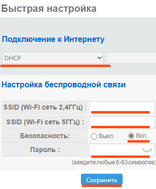 | 2.6. В открывшемся окне Быстрая настройка установите в «Подключение к Интернету» DHCP, в поле SSID (Wi-Fi сеть 2,4ГГц) замените заводское название Wi-Fi сети на свое, в поле SSID (Wi-Fi сеть 5ГГц) замените заводское название Wi-Fi сети на свое, отметьте в строке «Безопасность» Вкл., в поле Пароль замените заводской пароль для Wi-Fi сети на свой. Нажмите Сохранить | ![]() |