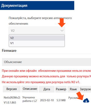 | 3.2. Зайдите на сайт производителя по ссылке Выберите в Документации версию вашего роутера. Будьте внимательны, установка неверной версии может привести к неисправности устройства. Ознакомьтесь с информацией производителя по обновлению. Загрузите на компьютер последнюю версию прошивки в поле Загрузки. | ![]() |