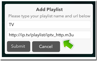 | 2.3. Введите адрес плейлиста http://ip.tv/playlist/iptv_http.m3u Нажмите Submit | ![]() |