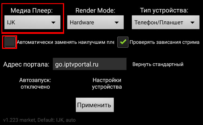 Если по каким-то причинам предустановленный медиаплеер не воспроизводит телевидение, зайдите в настройки IPTV PORTAL и смените медиаплеер.